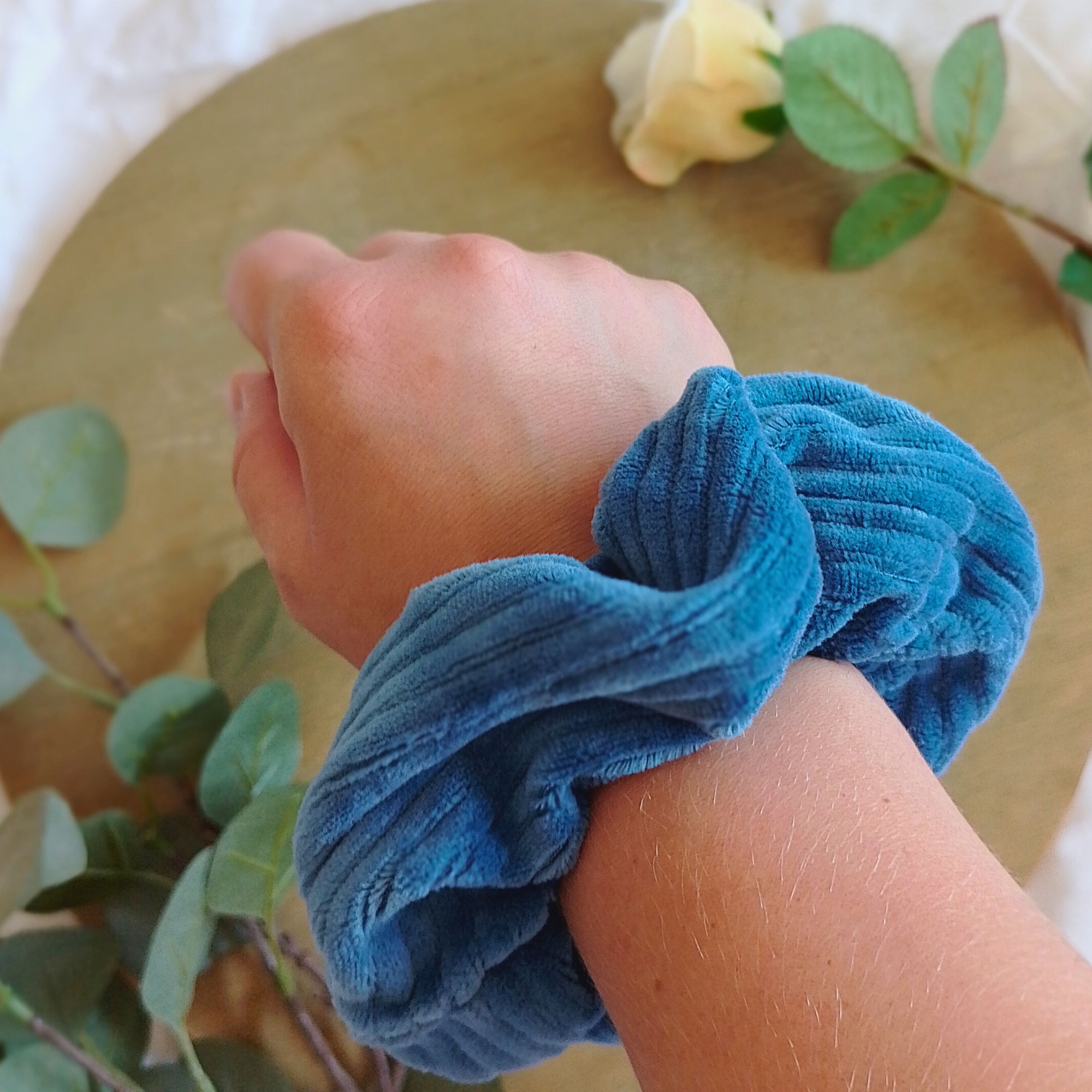 De scrunchies worden gemaakt uit rekbare, geribde stoffen en we maken gebruik van zachte elastiek.