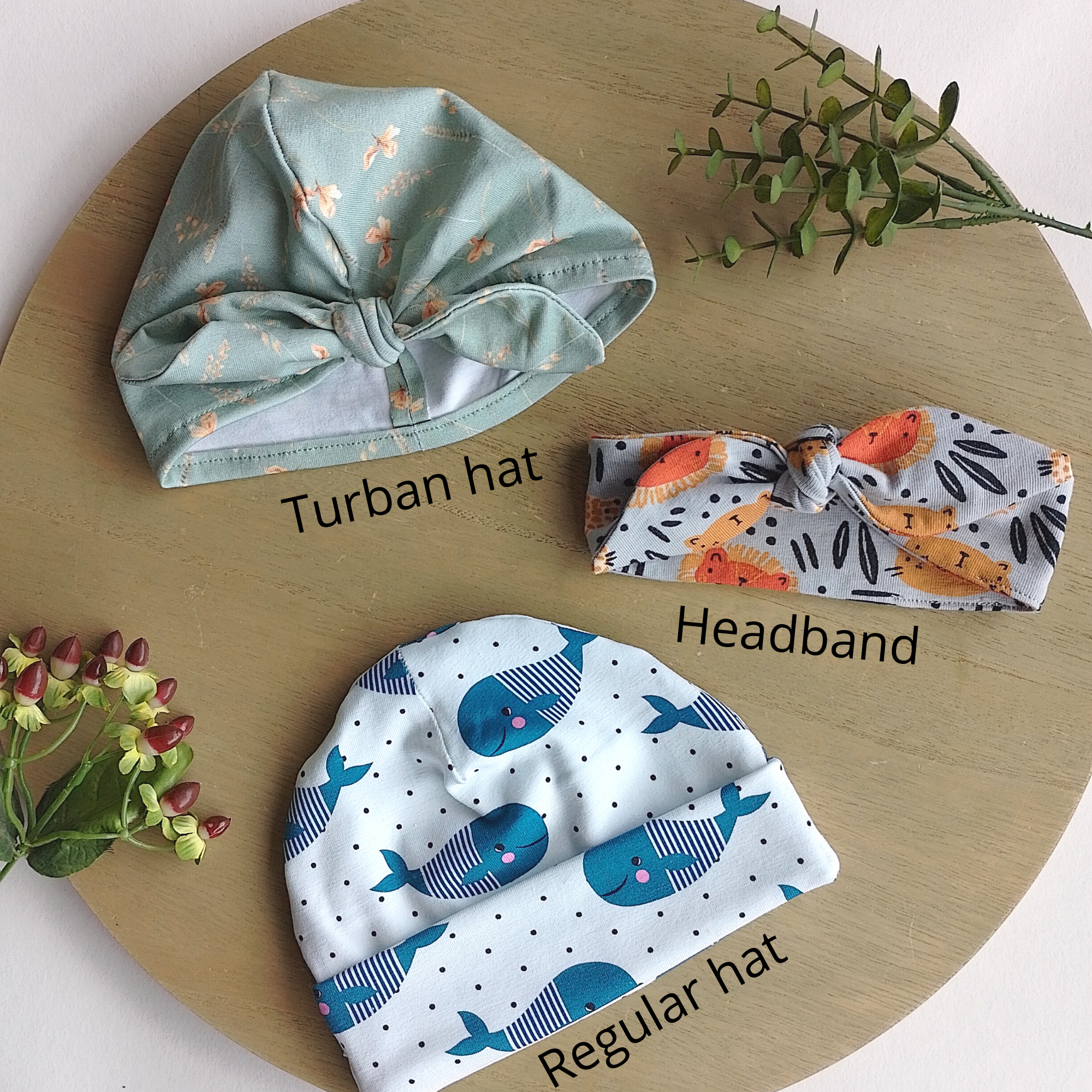 - Bij het bestellen kan je de maat en kleur kiezen. Vermeld bij de opmerkingen of je graag een muts/turban muts/haarband hebt.