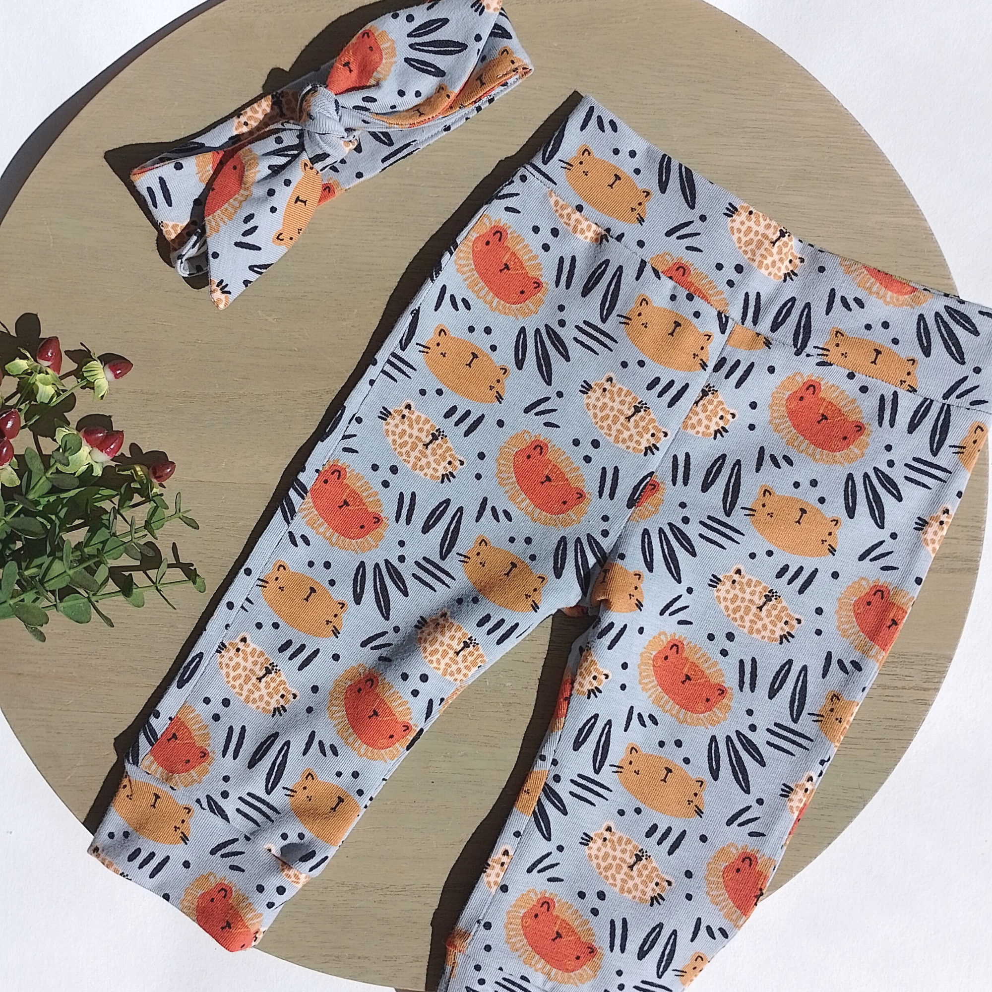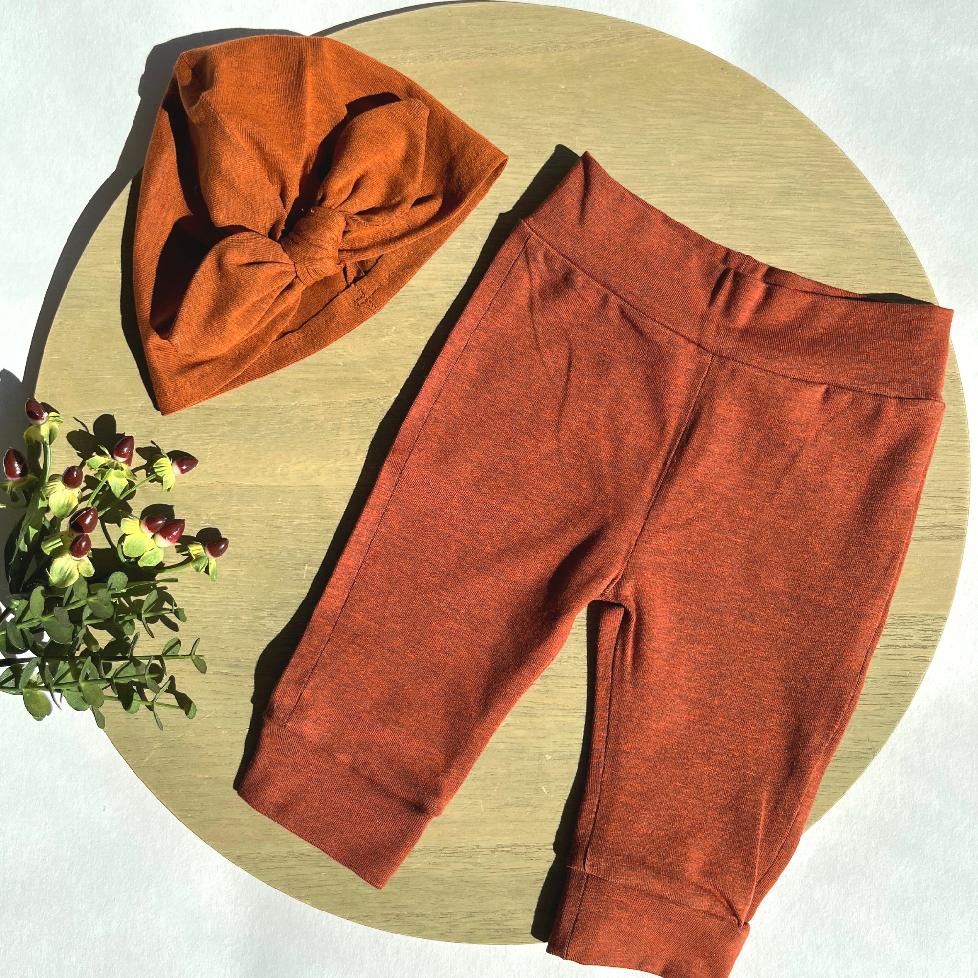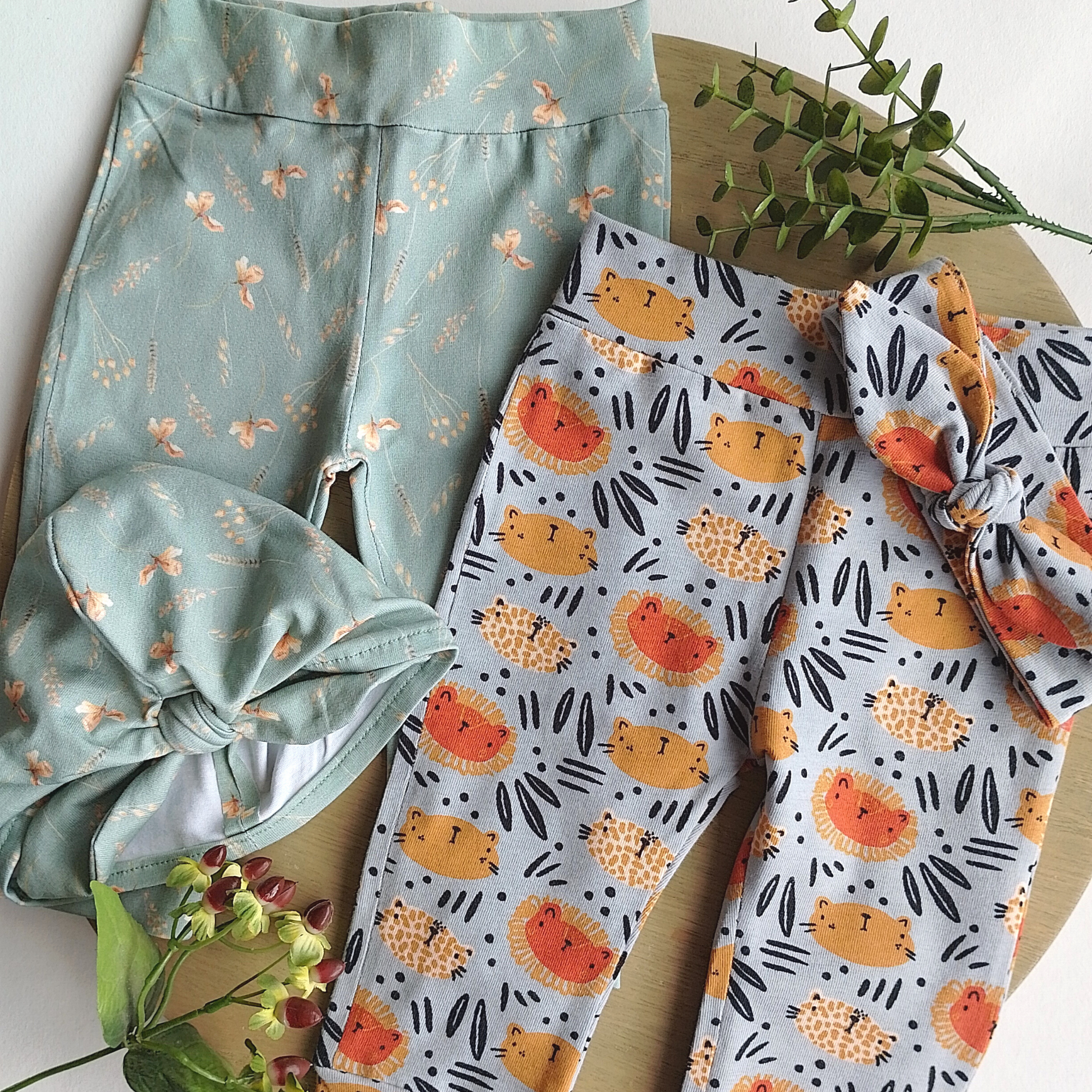Zowel de broekjes als de bijpassende muts/haarband worden gemaakt uit tricot. Een zachte, stretchy stof die comfortabel aanpast aan het hoofdje en de billetjes.